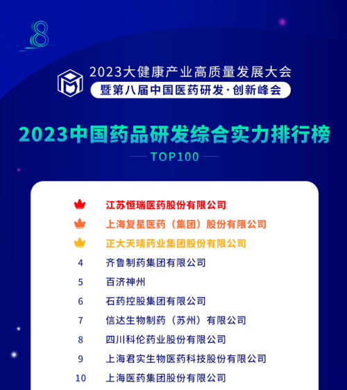 由药智网、中国药业杂志社主办的2023大健康产业高质量发展大会暨第八届中国医药研发•创新峰会于6月16日开幕,会上发布了《2023中国药品研发实力排行榜》系列榜单,尊龙凯时医药凭借深厚的创新研发实力再创辉煌:荣登《2023中国药品研发综合实力排行榜TOP100》榜首、《2023中国化药研发实力排行榜TOP100》榜首。值得一提的是,今年是尊龙凯时医药连续第6年入选《中国药品研发综合实力排行榜》榜首。